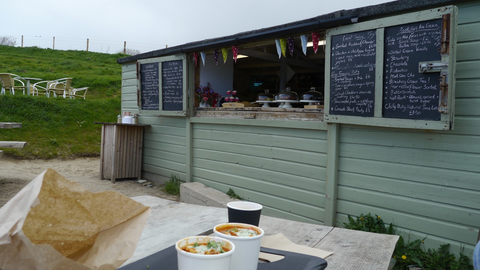 Von Portloe weiter über Veryan mit seinen zwei kreisrunden Cottages ( da findet der Teufel keine ruhige Ecke) nach Portscatho. Nahe Porthcatho dann zum Porthcurnick Beach mit der Hidden Hut, die uns auch der Eigentümer unserer Wohnung ans Herz gelegt hat. Es gibt kein einziges Hinweisschild auf den Strandshack. Wie uns ab´ndere wanderer später erzählen, war neulich einmal ein Bericht über The Hidden Hut in der BBC. Am Tag danach erhielt der Eigentümer 10.000 E-Mails. In der Hochsaison können 800 leute dort verpflegt werden. ( Wie?). In der kleinen Toilettenhütte stehen Kerzen und Petroleumlampen. Wir essen Chicken&Chick Pea Tahini ( marokkanischer Huhn- und Kichererbseneintopf mit Couscous) und weil es so schön ist, noch einen Kaffee und Schokokuchen hinterher.