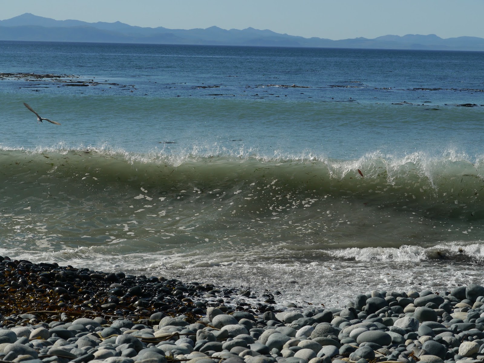 Ich gehe über einen bequemen Waldweg zum Ende der Bucht, links liegt dichter Wald und so bin ich ganz froh, als ich Puma-frei wieder auf dem offenen Strand bin. Am Ende der Bucht hat sich Sand angesammelt, ein paar Regenpfeifer stochern mit ihren Schnäbeln im Boden herum. Auf den Wellen schaukeln und Möwen. Ab und zu fliegt eine Schar Kormorane niedrig über das Meer. Über dem Wald, hoch oben, kreist ein Weißkopfadler (wir haben ein Fernglas mit). Nur die hier wohl zahlreichen Otter lassen sich nicht blicken. Es ist allerdings auch schwer, sie von den Spitzen des "Kelp", der langen schlauchförmigen Algen mit einer Blase an der Oberfläche zu unterscheiden.