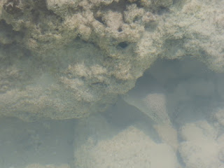 Ich mache nach dem Frühstück einen Spaziergang durch unsere trockengefallene Bucht. Man denkt, oh das Riff ist ja tot und, na klar, war ja einmal der Hafen der Plantage, also kein Wunder. Und dann tritt man fast auf einen Rochen oder es saust ein fast nicht sichtbarer weißer Fisch um die Knöchel und im nächsten Großen Tümpel kreist ein kleiner Riffhai. Die dicke Wurst unter der Koralle schlängelt sich heraus und wird zur Moräne! Ein Reiher steht vor der Flutgrenze und ich stehe Ewigkeiten mit dem Fotoapparat im Anschlag. Und er fliegt nicht! Immerhin gelang es mir vorher, einen im Schnappschuss zu erwischen. Luxusproblem.